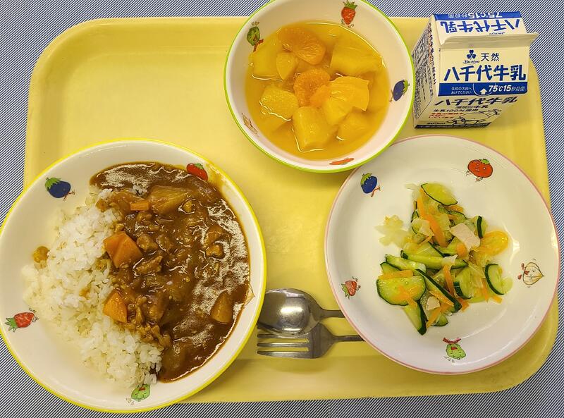 今日の献立は、麦ごはん、牛乳、梨入りカレー、レモンサラダ、フルーツポンチ、です。