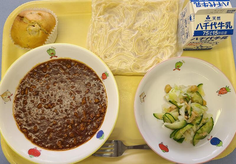 献立は、スパゲティ、牛乳、キャロットソース、ひよこ豆のサラダ、梨のマフィン、です。