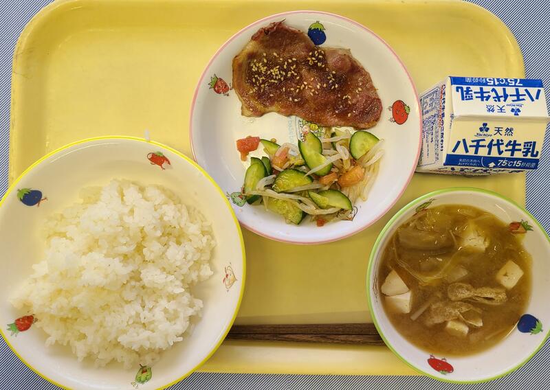 献立は、ご飯、牛乳、豚肉の梨ソース、トマトときゅうりのサラダ、キャベツとえのきの味噌汁、です。