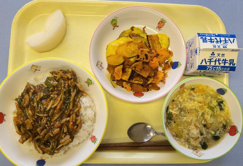 献立は、麦ご飯、牛乳、チンジャオロース丼の具、中華風コーンスープ、野菜チップ、市川の梨、です。
