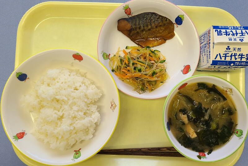 献立は、ご飯、牛乳、鯖の味噌煮、きゅうりと春雨の酢の物、切り干し大根と油揚げの味噌汁、です。