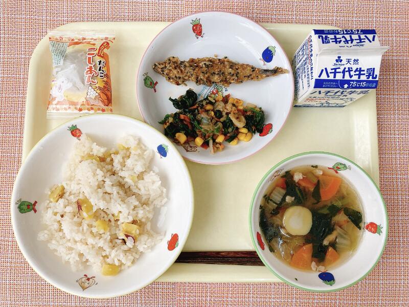 献立は、さつまいもご飯、牛乳、ししゃものごま揚げ、おかか和え、すまし汁、月見団子、です。