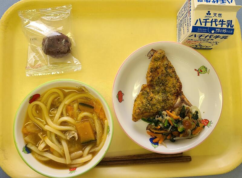 献立は、五目うどん、牛乳、鰺の磯辺揚げ、おろし和え、おはぎ、です。