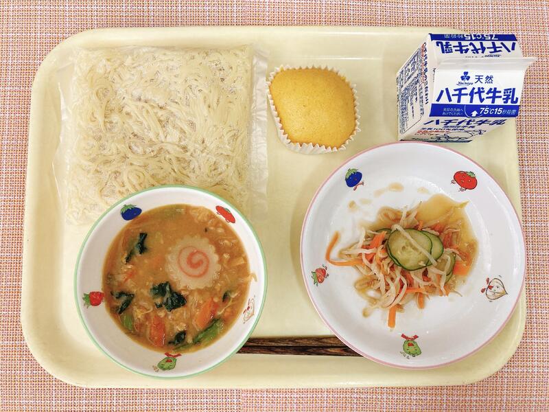 献立は、味噌ラーメン、牛乳、中華サラダ、かぼちゃ蒸しパン、です。