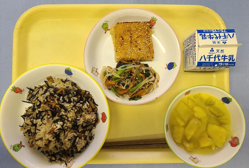 献立は、ひじきご飯、牛乳、松風焼き、三食おひたし、さつま芋のミルク煮です。