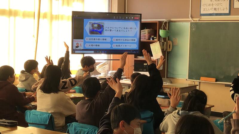 1月12日(木)、5年生を対象にトヨタ自動車オンライン授業が行われました。ワークシートを使いながら、映像やクイズを交えて、自動車産業やクルマができるまでのアイディアや工夫について、詳しく説明していただきました。最後には、質問コーナーもあり、子どもたちはとても意欲的に参加していました。