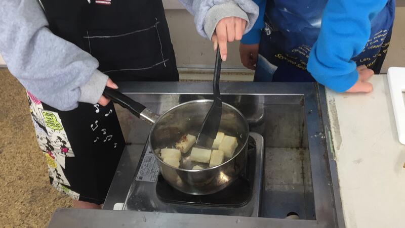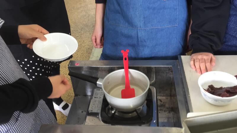 6年生が「ふるさと探究科」の学習の一環として、和菓子作りに挑戦しました。自分たちで作り方のレシピを調べ、揚げ餅、豆大福、どら焼き、羊羹などの和菓子をグループで作りました。焼いたり、茹でたり、包んだりと和菓子作りの難しさを体験し、また、和菓子の材料がどんなものを使って作っているのかを知ることができました。