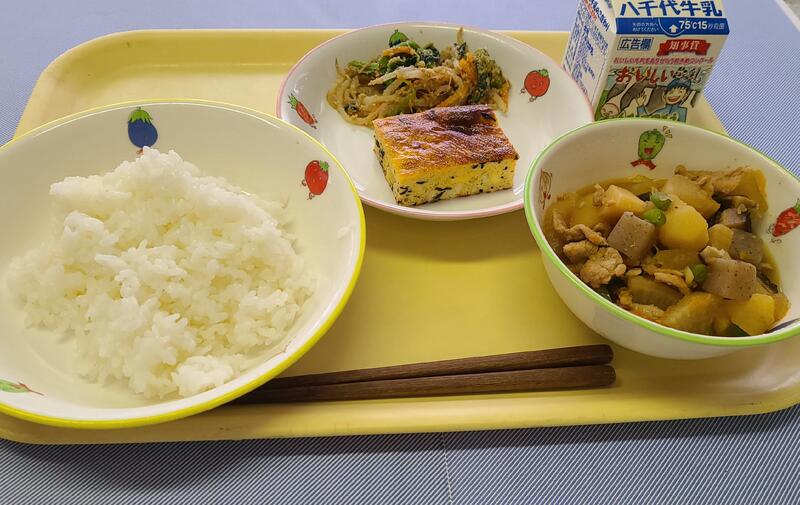 献立は、ご飯、牛乳、千草焼(ちぐさやき)、ごま和え、大根と豚肉の旨煮、です。
