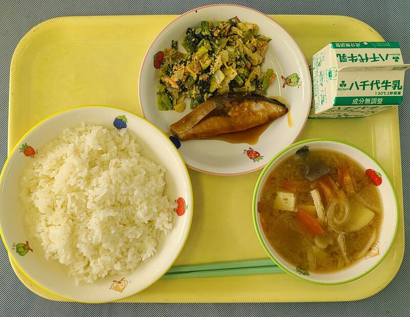献立は、ご飯、牛乳、いなだの照り焼き、ごま和え、クイズ!出汁当て味噌汁、です。