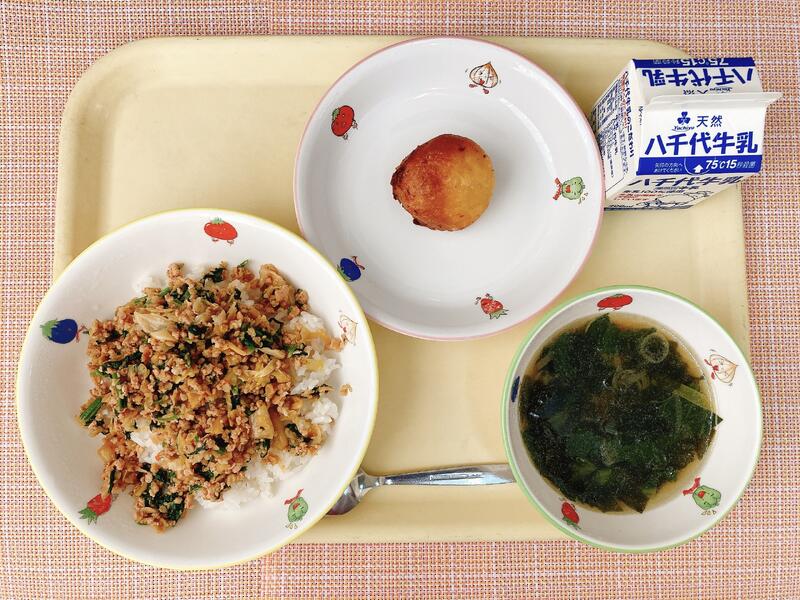 献立は、いりこ飯、牛乳、千種焼き、生揚げの肉味噌煮、です。