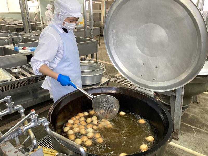 小さく折ったそうめんを周りにまぶしてトゲトゲのいがぐりを表現しています。→給食レシピ「いがぐり揚げ」