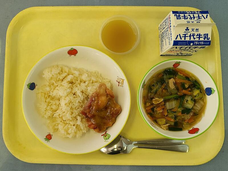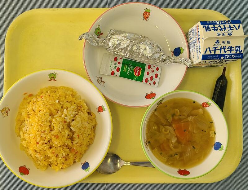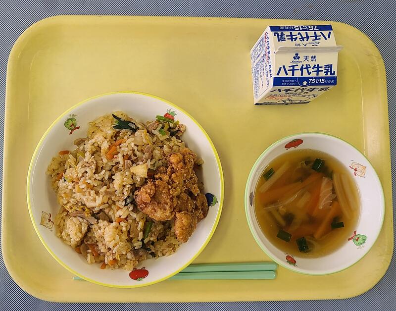献立は、キムチご飯、牛乳、鶏のから揚げ、中華スープ、です。