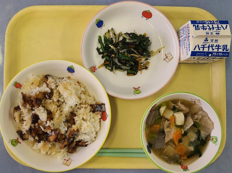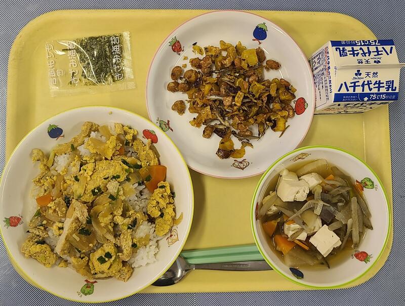 献立は、麦ご飯、牛乳、あぶたま丼の具、けんちん汁、大豆のカリカリ揚げ、です。