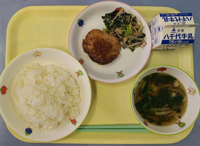 献立は、ご飯、牛乳、蓮根バーグ梨ソースかけ、磯和え、沢煮椀、です。