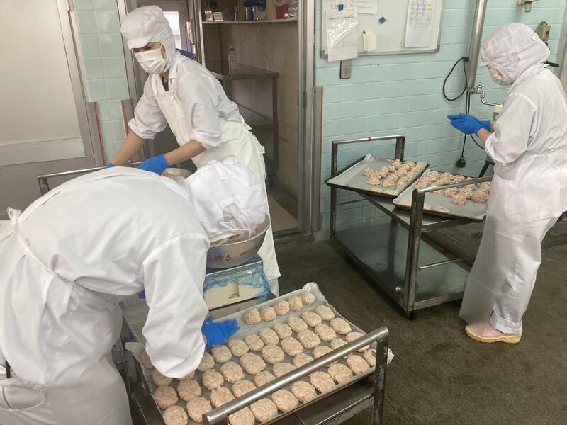 寺村輝夫作、岡本爽子絵、あかね書房「こまったさんのハンバーグ」を給食室で、曽谷っ子のみんなが食べられるよう、アレンジして調理しました。