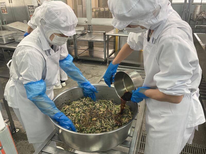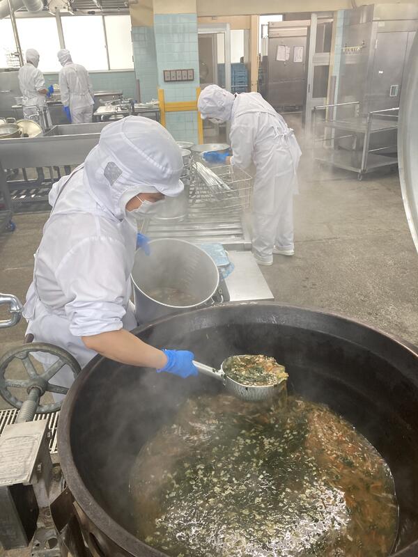曽谷小学校の給食室でも調理員さんが役割を決め、毎日丁寧においしい給食を作ってくださっています。