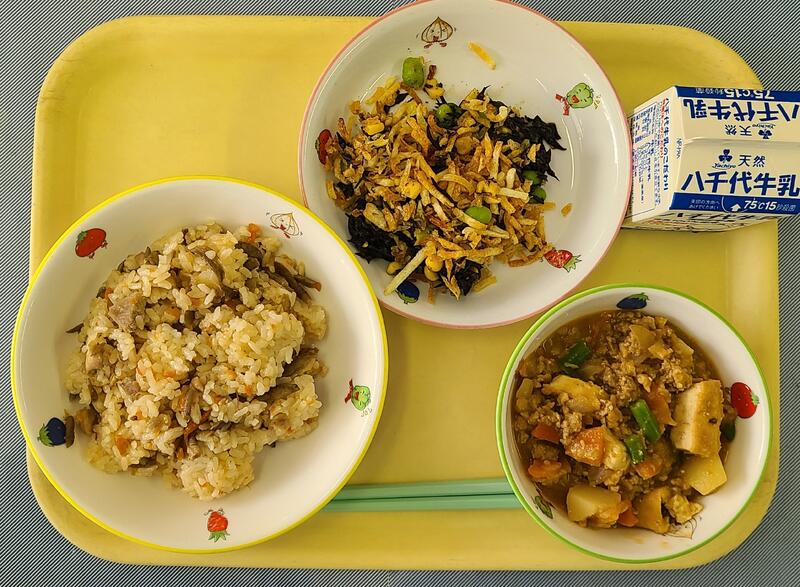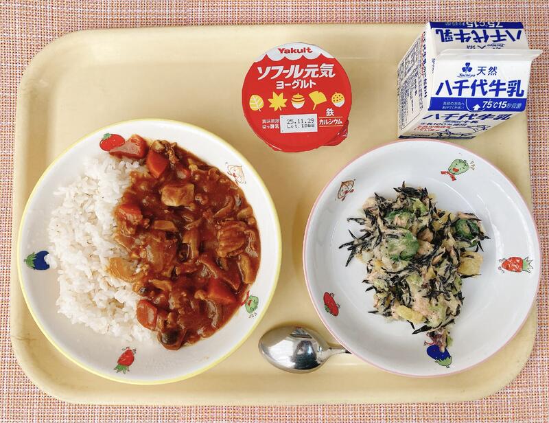 献立は、麦ご飯、牛乳、秋野菜カレー、ひじきとツナのサラダ、ヨーグルト、です。
