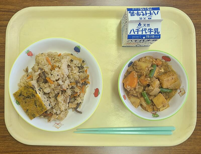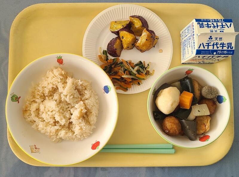 献立は、茶飯、牛乳、一口おでん、からし和え、大学いも、です。