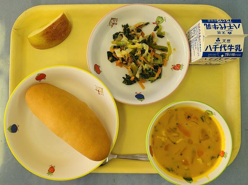 献立は、コッペパン、牛乳、かぼちゃスープ、海藻サラダ、りんご、です。