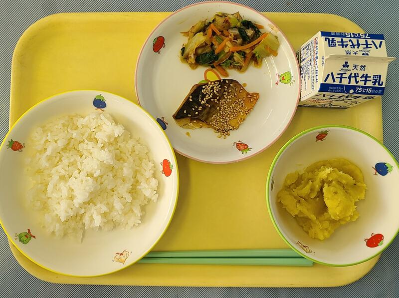 献立は、ご飯、牛乳、鯖の利休焼き、三色おひたし、さつまいものミルク煮、です。