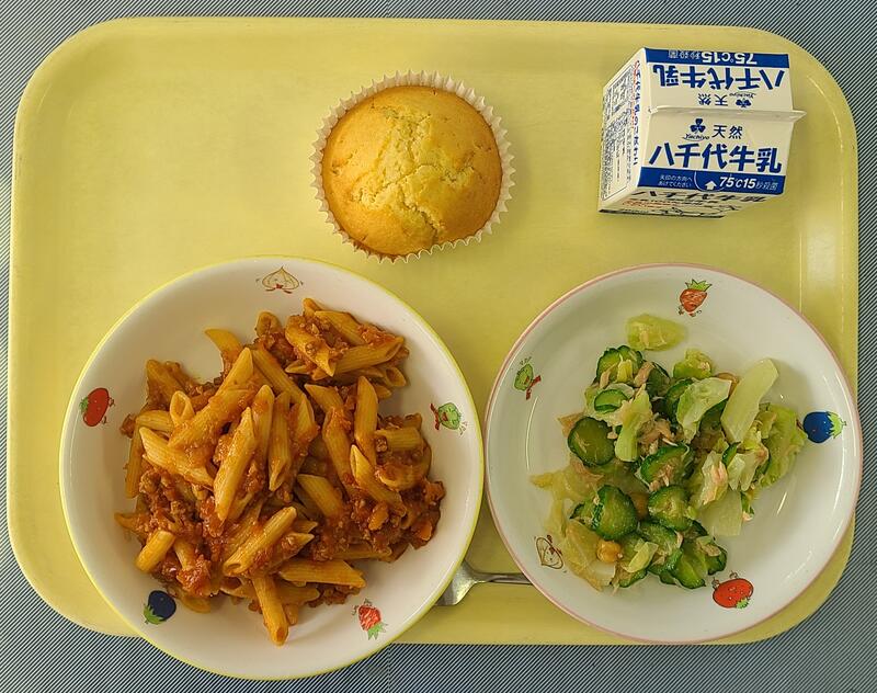 献立は、ペンネのミートソース、牛乳、ひよこ豆のサラダ、ぐりとぐらのカステラ、です。
