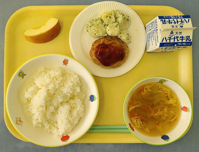 献立は、ご飯、牛乳、こまったさんのハンバーグ、青のりポテト、オニオン卵スープ、りんご、です。