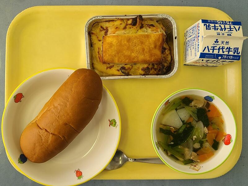 献立は、黒糖パン、牛乳、キキの運んだパイ、かぶのスープ、です。