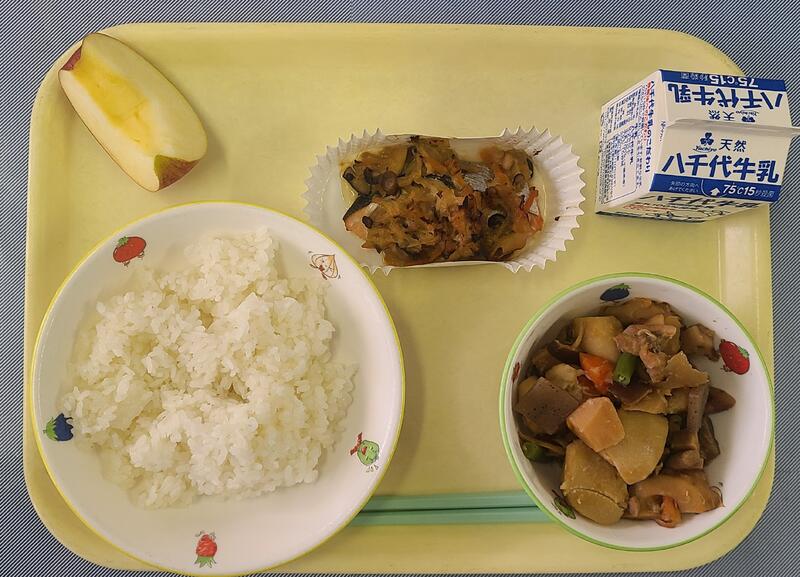 献立は、ご飯、牛乳、チャンチャン焼き、筑前煮、りんご、です。