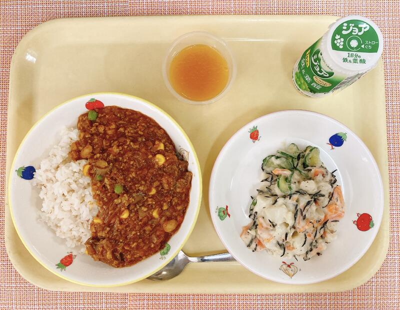 献立は、麦ご飯、ジョア、キーマカレー、ひじポテサラダ、キャロットゼリー、です。