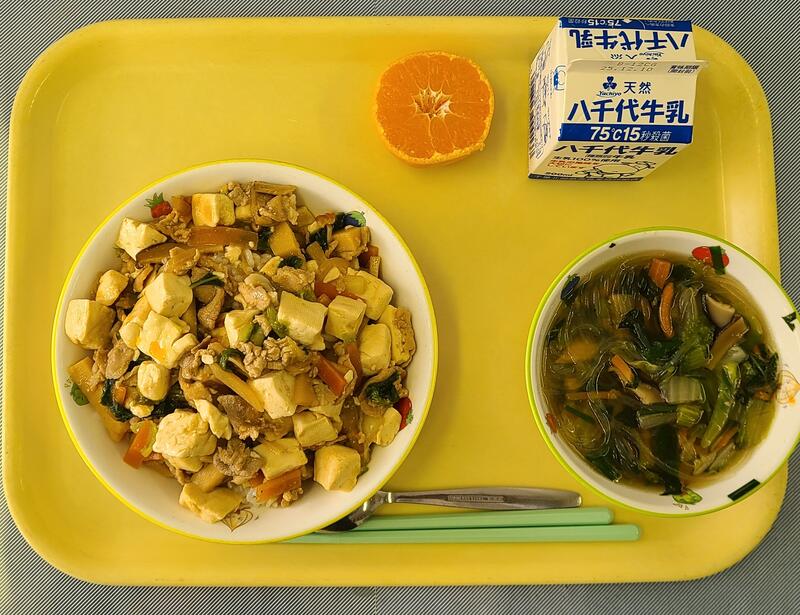 献立は、麦ご飯、五目豆腐、春雨スープ、花みかん、です。