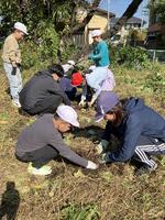 いちょう学級のみんなで校内の畑で収穫したさつまいもを、防災ベンチわきで焼き芋にして味わいました。