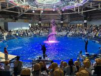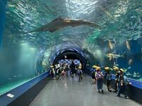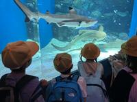目の前で自分の体より大きなサメやエイが泳ぐ様子に驚き、イルカショーでは、水しぶきを浴びる子もいました。