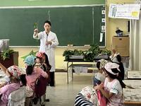 皮むきの前には、栄養教諭よりとうもろこしは雄花と雌花があること、雄花の花粉が雌花について受粉すること、