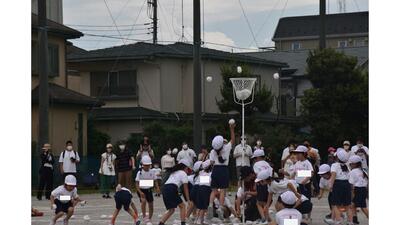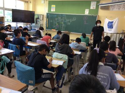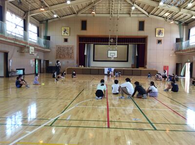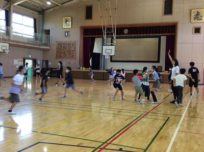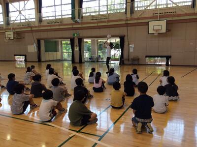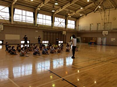 元バレーボール選手の持丸先生と元サッカー選手式田先生と一緒に楽しく体を動かしました。