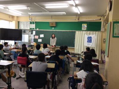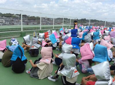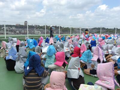 地震が起こった想定で教室で揺れがおさまるまでシェイクアウト訓練を行い、その後屋上に避難しました。