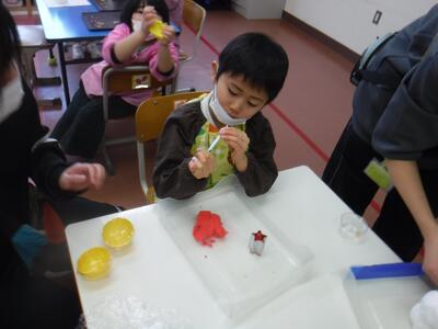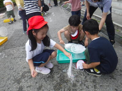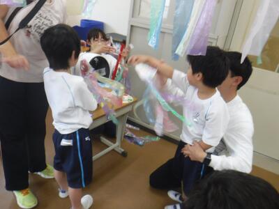 1年生は先週に続いてシャボン玉体験。今回は稲越小学校の一年生と一緒に行いました。