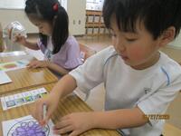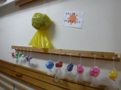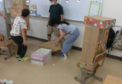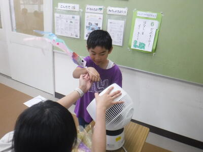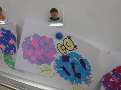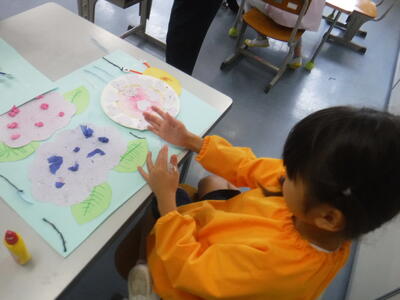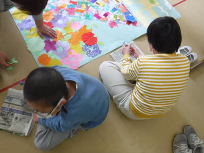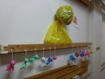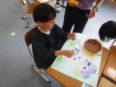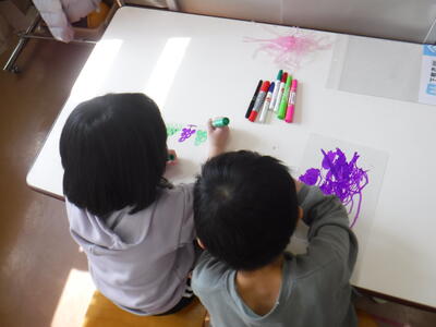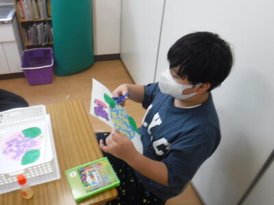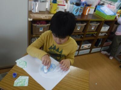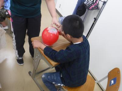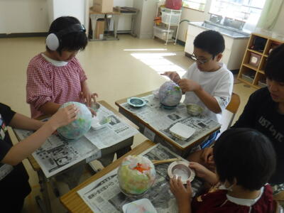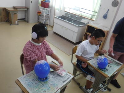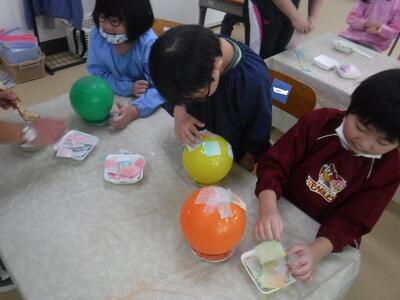 4年生は風船に紙をぺたぺた。何が完成するのか楽しみですね。