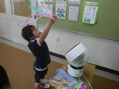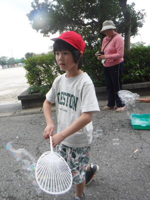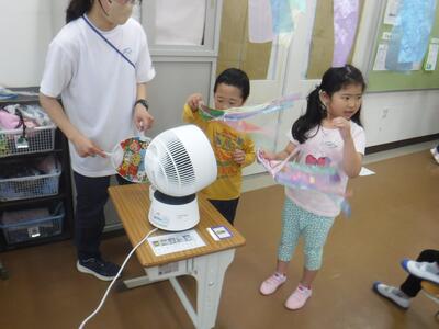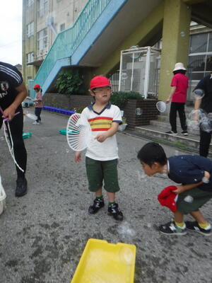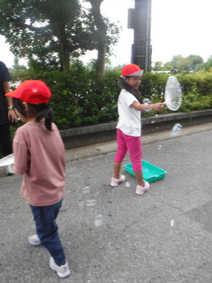 ひもや団扇を使ってシャボン玉を作ったり、できたシャボン玉を見上げたり追いかけたりと楽しんでいました。