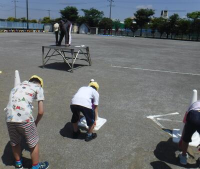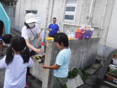 小学部の子どもたちも一人一人がペットボトルなどの水を校庭に撒きました。