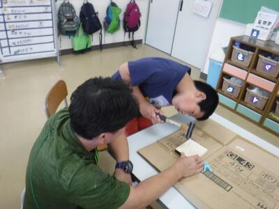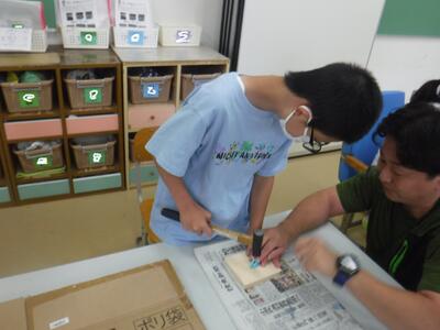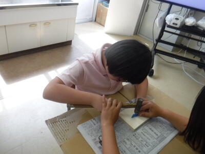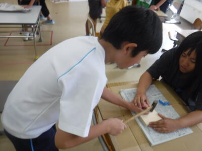 6年生は金づちに挑戦です。釘をトントン頑張って打ち込んでいました。
