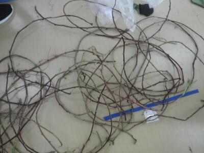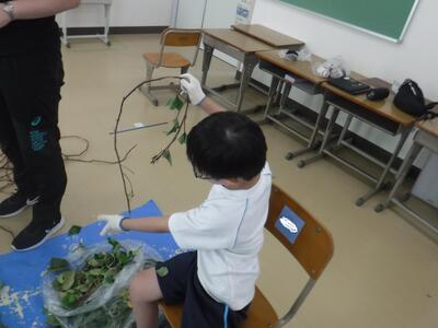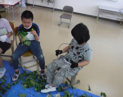 4年生はサツマイモの葉っぱを取り、リース作りの準備をしました。