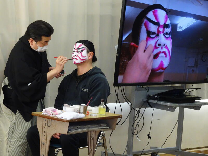 1月26日(木)に高等部全学年で、NPO法人伝統文化未来塾 代表理事長の立花志十郎 様をお迎し、【歌舞伎ワークショップ】を行いました。歌舞伎の台詞や立ち回り、特徴ある化粧の「隈取」について教えていただきました。実際に『共奴』という演目を演じていただき、充実した時間となりました。