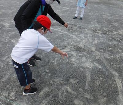 小学部の子どもたちも一人一人がペットボトルなどの水を校庭に撒きました。