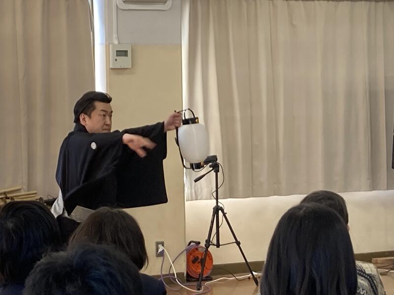 1月26日(木)に高等部全学年で、NPO法人伝統文化未来塾 代表理事長の立花志十郎 様をお迎し、【歌舞伎ワークショップ】を行いました。歌舞伎の台詞や立ち回り、特徴ある化粧の「隈取」について教えていただきました。実際に『共奴』という演目を演じていただき、充実した時間となりました。