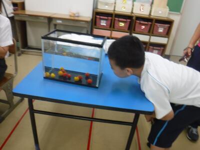 甘いトマトは水に沈むそうです。クイズやピーマンのヘタ(種)取りなどにも挑戦しました。