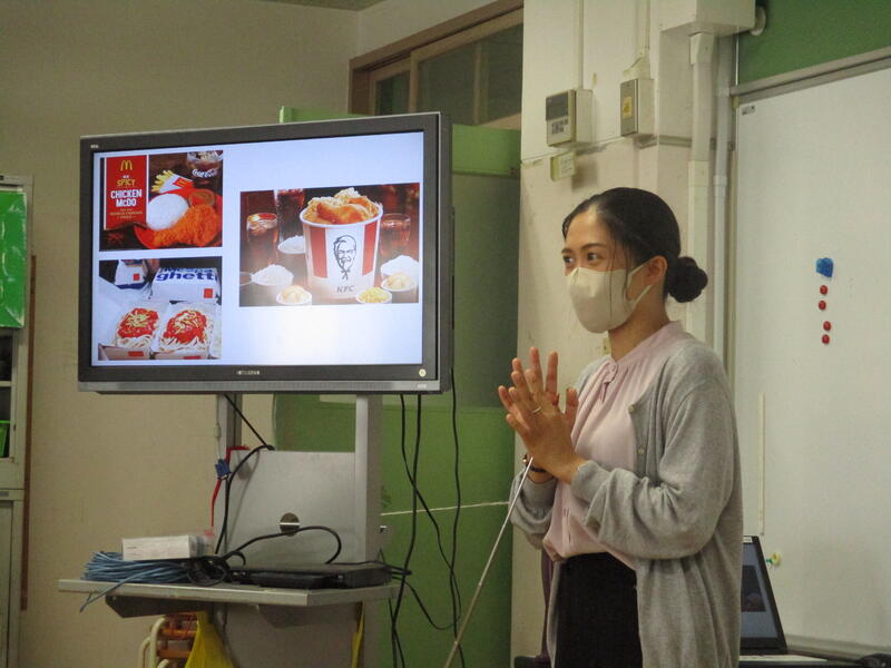 自己紹介の場面。ファーストフード店の写真に目を丸くしました!