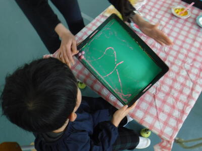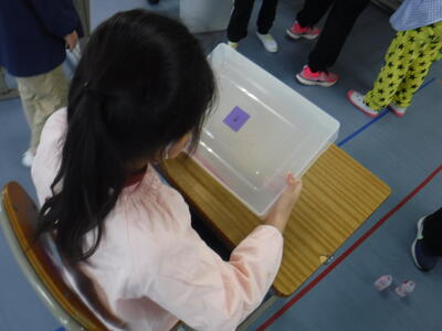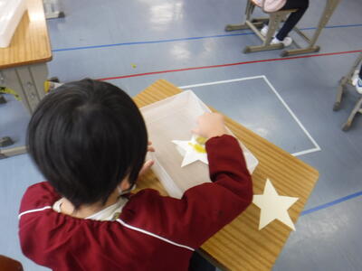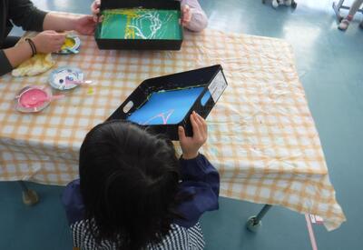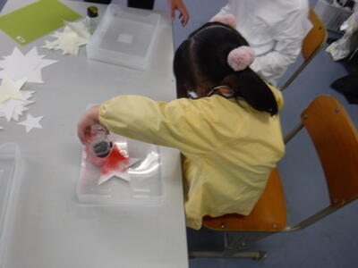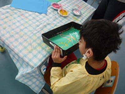 1年生はビー玉を転がして絵を描きました。