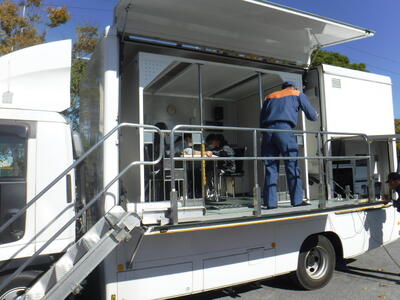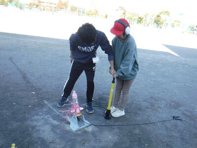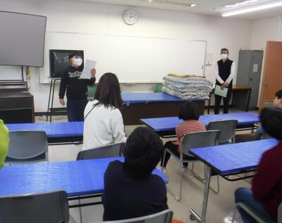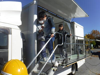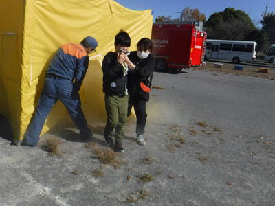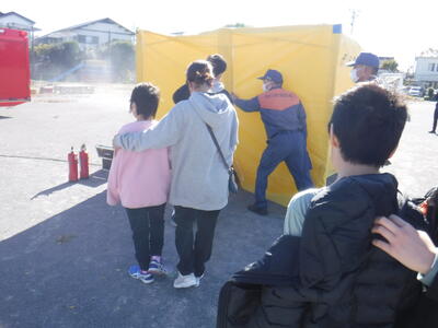 その後、1.2.3年生は消火訓練を見学し、4.5年は煙中体験、6年は起震車で地震体験をしました。