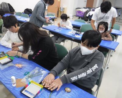 朝食後は梨の木ペンダントを作成したり、体育室でレクを行ったりしました。