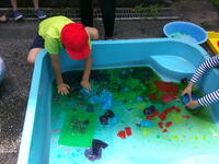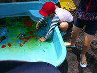 2年生は「感触遊び」!食紅で色を付けた水にゼラチンを入れて冷やして固め、ゼリーのようなものを作りました。